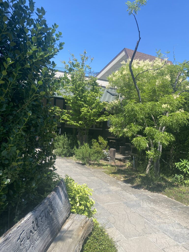 お店に着くと、まず目に飛び込んでくるのが温もりあふれる木の外観と、緑に囲まれたナチュラルな佇まい。