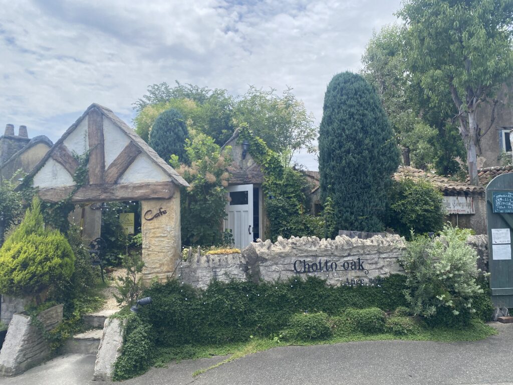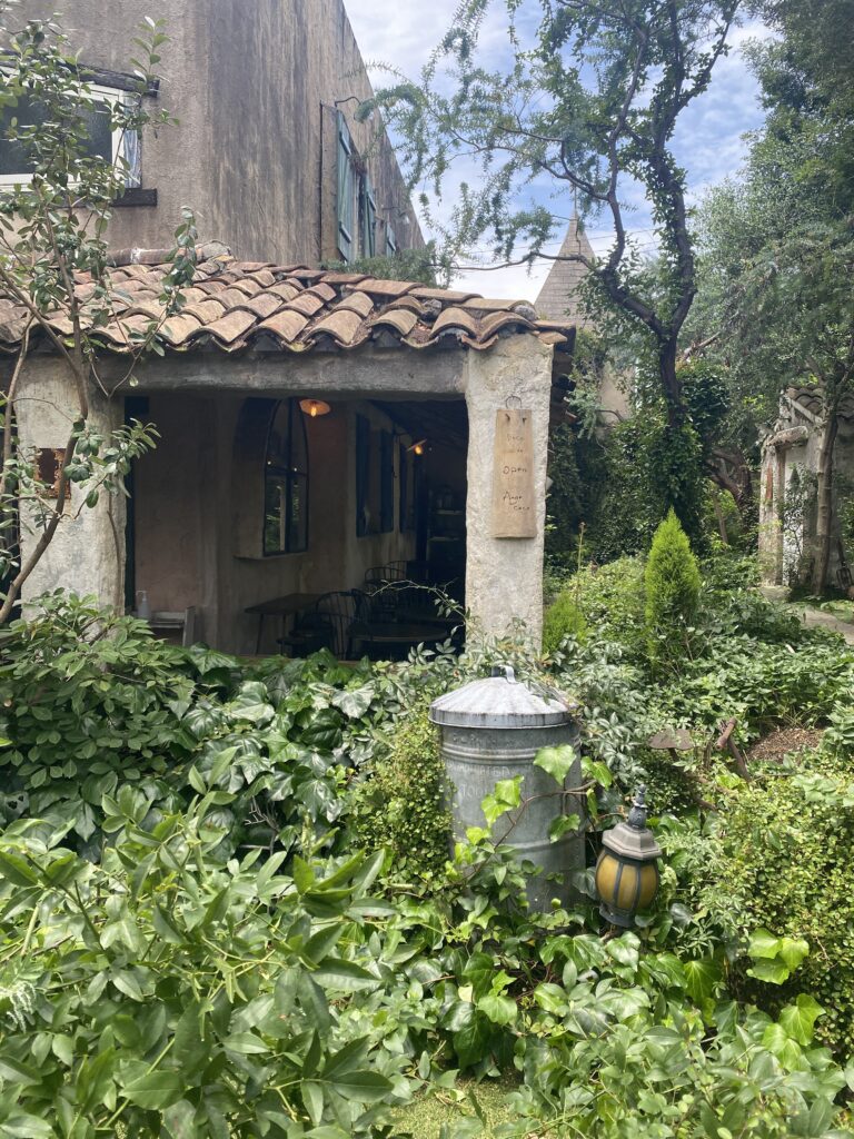 門をくぐると、石壁に囲まれたヨーロッパ風の建物や緑の庭、小さなカフェ小屋が点在し、