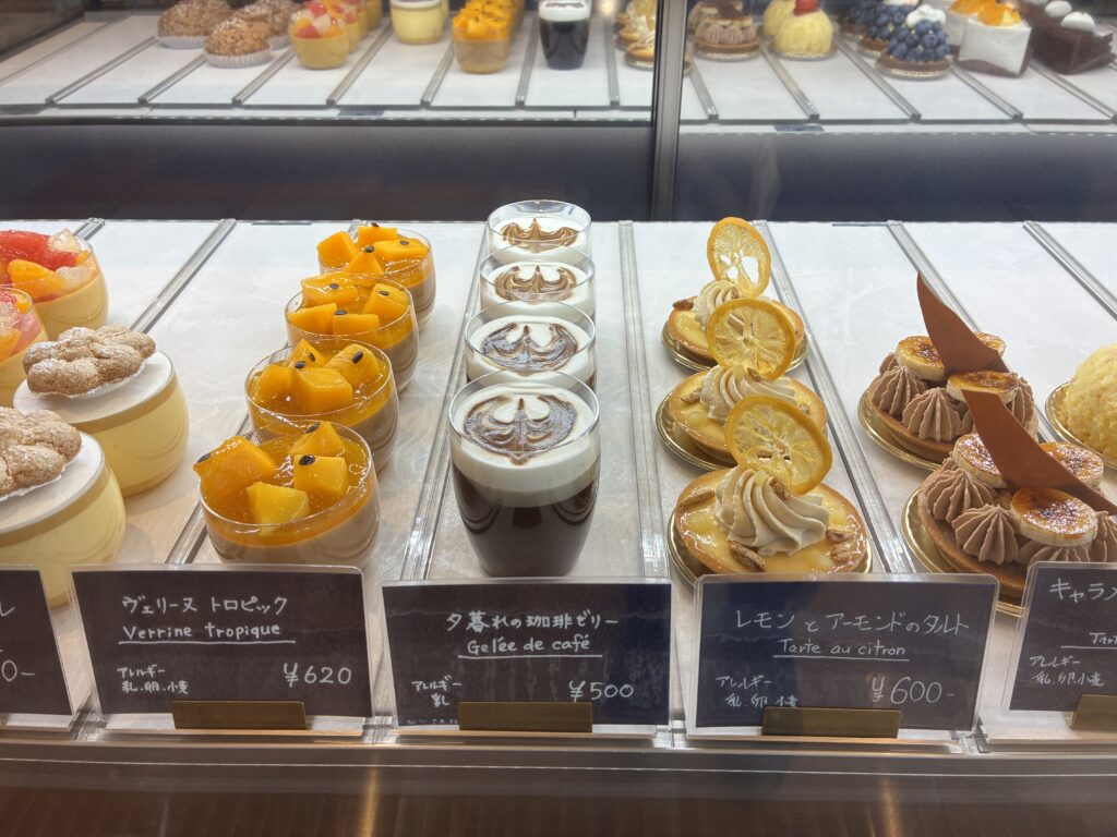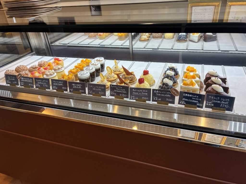 ショーケースには、季節のフルーツを使ったフルーツタルトやムースケーキ、クラシックショコラなどが美しく並んでいます。