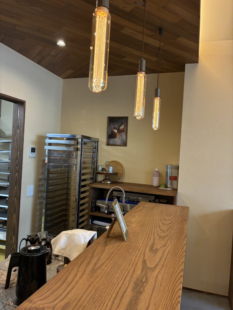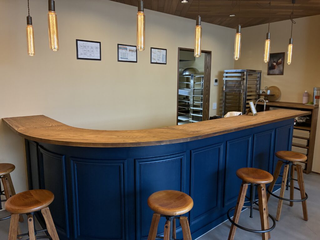 木のぬくもりとネイビーのカウンターが特徴的な店内は、静かで心落ち着く雰囲気。